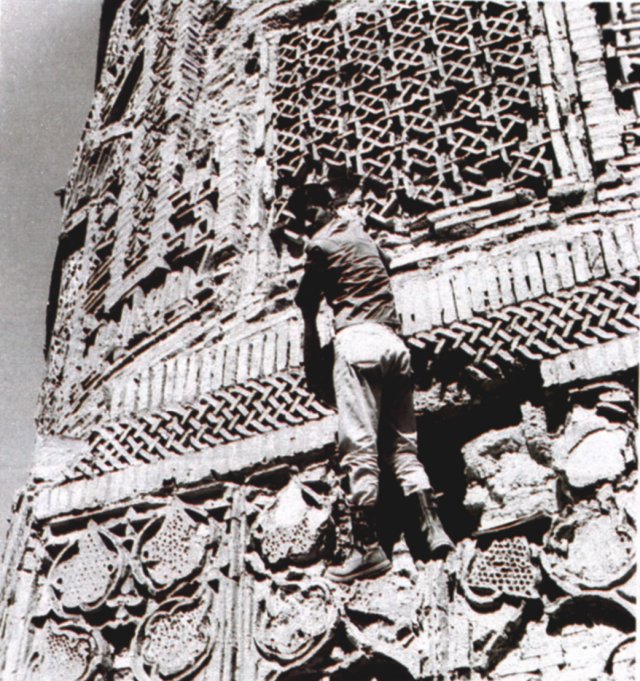 Nel 1960, continua Bruno, "lo cercai anch’io, in un intrico di valli e di montagne al centro dell'Afghanistan, naturalmente senza strade degne di questo nome. Quando stavo per darmi vinto, ecco l'emozione di vederlo davanti a me. Alto 70 metri, a duemila metri di quota, su base ottagonale, era stato costruito alla confluenza di due fiumi, uno dei quali, un impetuoso torrente di montagna, aveva "mangiato" nel tempo quasi tutto il terreno su cui poggiava da una parte; e il rischio era che prima o poi il minareto, già lievemente inclinato, crollasse. Dopo gli studi e la preparazione dei progetti di restauro, il nostro primo lavoro, nel 1963, è consistito in una prowisoria arginatura in pietre e legnami locali. L'Unesco mi ha poi affidato, nel 1974, lo studio di un progetto di restauro, e nel 1978 è stata finanziata una prima opera che doveva portare alla costruzione di un argine costituito da gabbioni metallici zavorrati da pietrame, in vista di interventi successivi sulle fondazioni. La guerra, con tutto quello che ne è seguito, ha fermato tutto".